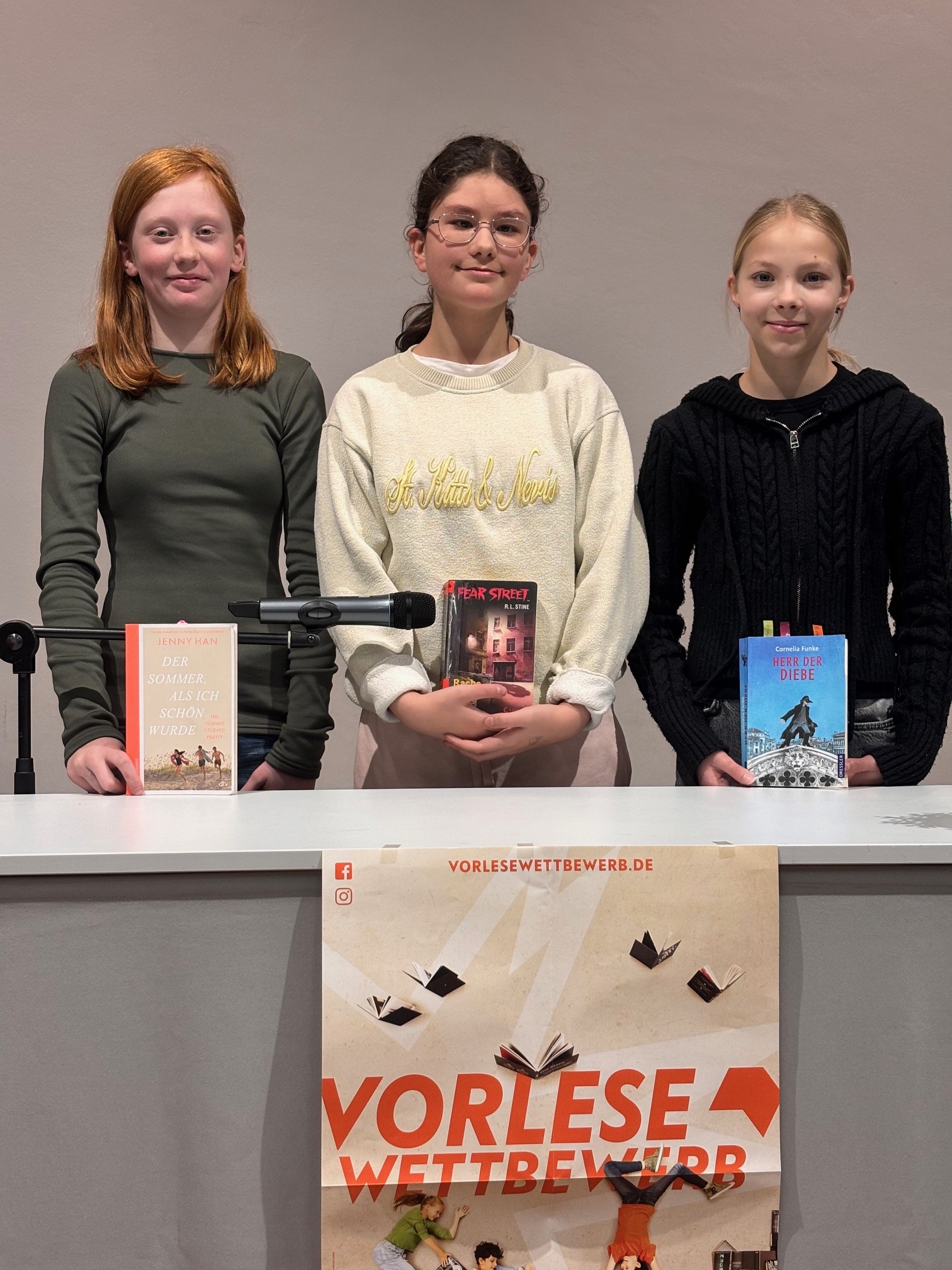 Am 8. Dezember 2025 fand an unserer Schule der diesjährige Vorlesewettbewerb des sechsten Jahrgangs statt. Die drei Klassensiegerinnen Cassady Menke (6b), Emily Löbert (6a) und Lena Hajnsek (6c) traten gegeneinander an und zeigten beeindruckende Leseleistungen.